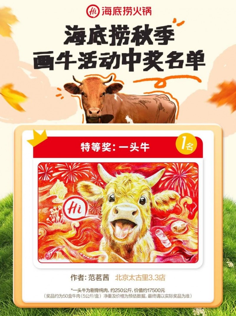 一头金黄色的小牛活灵活现地跃然纸上,圆溜溜的大眼睛里透着喜悦,吐着小舌头仿佛在对观众友好地打着招呼。背景则充满了热腾腾的火锅元素,仿佛连空气中都弥漫着暖意和香气。这幅作品以生动温暖的画风征服了网友们的心,最终从40多万幅投稿中脱颖而出,成为了海底捞“画牛”活动的最终冠军。而它的作者,来自北京太古里3.3店的“范茗茜”,也因此获得了“一整头牛”的惊喜大奖。