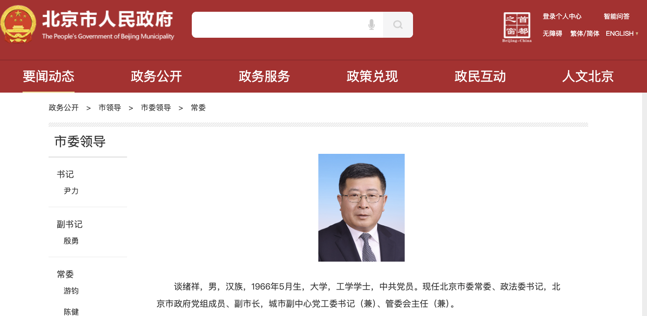 北京市政府官网“市领导”栏目信息更新显示,谈绪祥已任北京市委政法委书记。