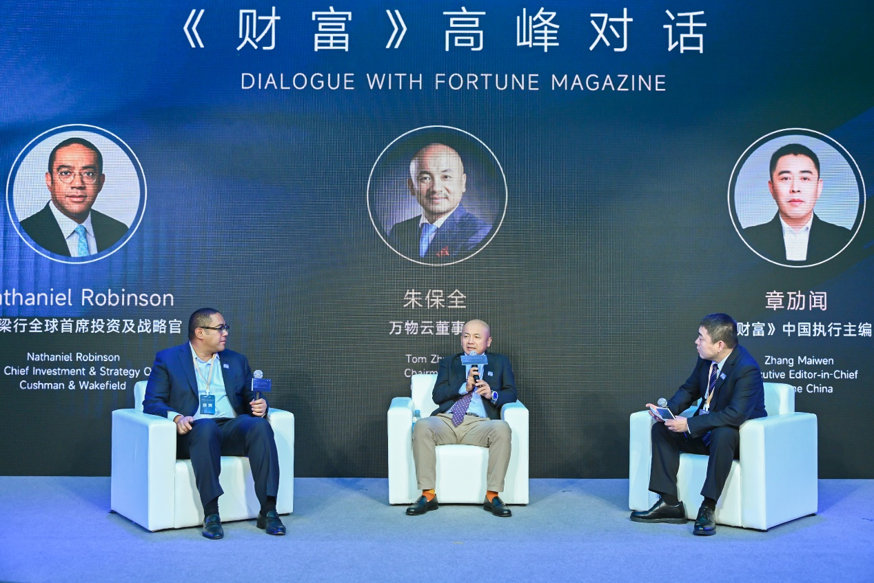 在本次发布会上,《财富》中国执行主编章劢闻高峰对话万物云董事长朱保全和戴德梁行全球首席投资及战略官Nathaniel Robinson。