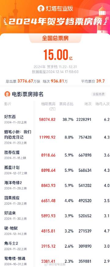 据灯塔专业版,截至12月14日17时58分,2024年贺岁档(11月22日—12月31日)档期票房(含预售)突破15亿。