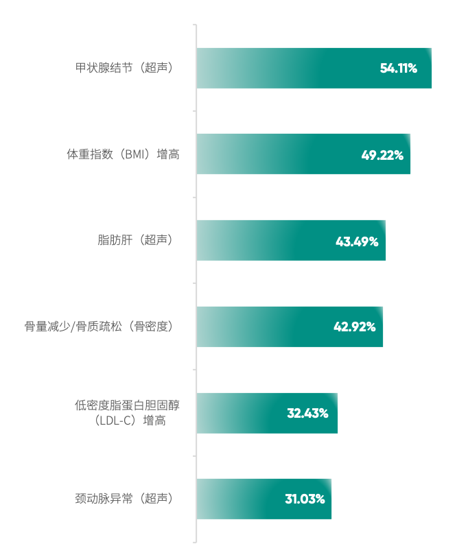 排除与性别相关的前列腺异常(超声)和乳腺结节(超声),甲状腺结节(超声)是中国企业家中位居TOP1的健康问题,高达54.11%的人“蝴蝶腺体”正发出警报,往下依次为体重指数(BMI)增高、脂肪肝(超声)、骨量减少/骨质疏松(骨密度)、低密度脂蛋白胆固醇(LDL-C)增高和颈动脉异常(超声),检出率均超过3成。
