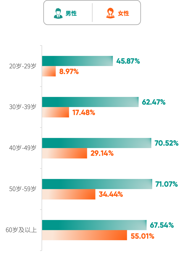 “中年发福”一词,一般用在男性身上更为贴切,相较而言,男性企业家的确在各个年龄段体重指数(BMI)增高的检出率均高于女性企业家。对于66.24%的男性企业家,企业管理轻松搞定,却败给了体重管理,其中,50岁-59岁更加“稳重”,达到峰值,检出率超过7成。