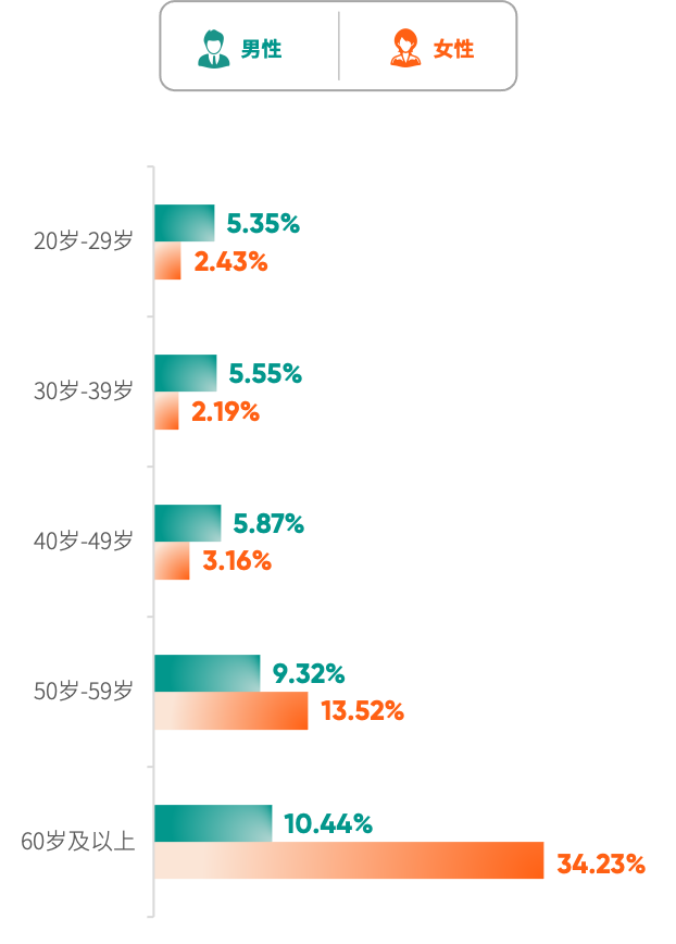 骨质疏松也是女性企业家体检报告上的“常客”,从50岁开始,女性企业家的骨质疏松检出率高于男性,60岁及以上的检出率超过34%,高于同年龄段男性企业家3倍,相当于每10人中,有超过3个人拥有“散装骨头”。