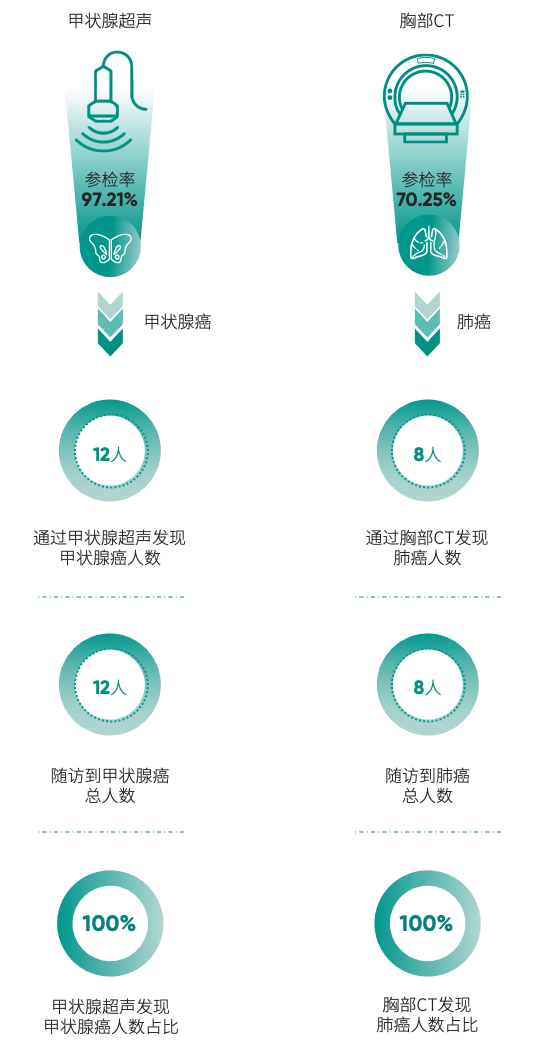 绿皮书中,甲状腺超声的参检率高达97.21%,但作为筛查肺癌最有效的手段,低剂量螺旋CT的参检率却是70.25%,如进一步提高对于风险人群的胸部CT参检率,将有机会发现更多的早期肺癌患者。从2021/2022年起,所有在爱康集团进行胸部CT检查的体检人群的CT影像结果,在专业医师阅片时,均会有医疗人工智能产品辅助诊断,对于肺癌蛛丝马迹的探寻更灵敏、更精准。