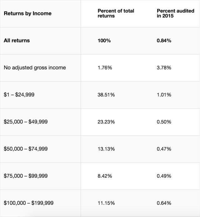 一份来自网站Money上,关于收入与被审查概率的统计表显示: