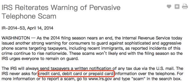 2、IRS不会通过电话询问被审查纳税人的信用卡、借记卡等银行卡信息。可以在IRS官网搜索“Scam”查看更多关于诈骗的案例,这样如果真的有一个遇到也可以见招拆招,指破骗局。