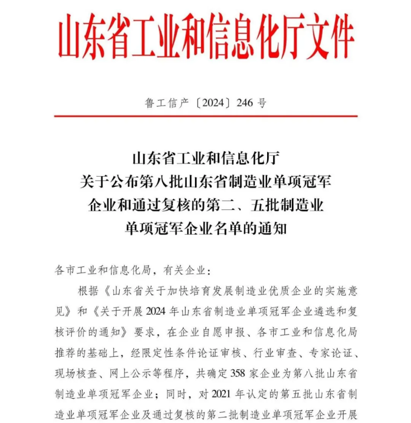 山东省制造业单项冠军企业是指长期专注于制造业特定细分领域,生产技术或工艺水平达到国内领先水平,单项产品市场占有率位居国内行业前列的制造业企业。制造业单项冠军认定,重点评估企业专业发展、市场竞争、自主创新、经营管理等指标,其代表着我国细分行业最高的发展水平和行业领先地位,是制造业领域的第一方阵。