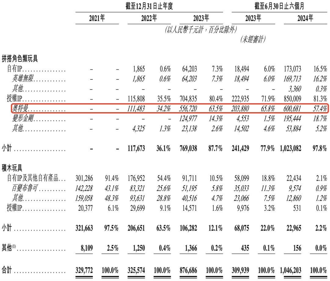 积木人之所以卖得这么好,靠的就是奥特曼。仅奥特曼这一个IP,2023年就贡献了六成多的收入,到今年年中,也贡献了近六成。