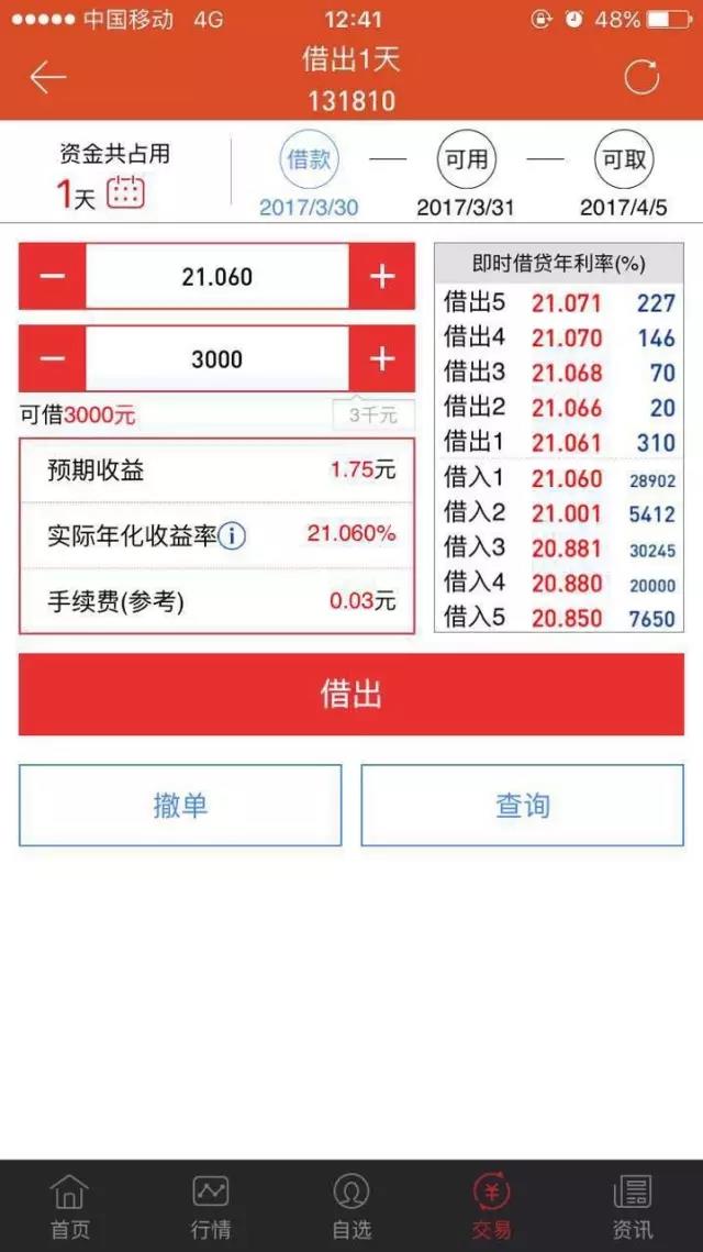 但需要注意的是!今天(3月30日)借出去明天31日就自动到账户,到了4月5日钱才可以提现,因为中间有个清明的小长假。所以大家操作的时候的一定要注意假期。