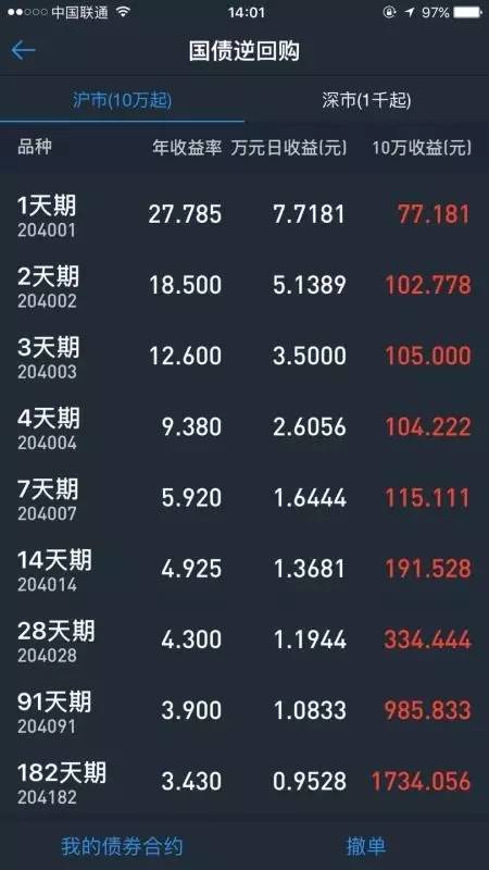 这个还看不懂的话,有的手机炒股软件会看得更明白一些,例如下面深交所一天期逆回购的操作图。