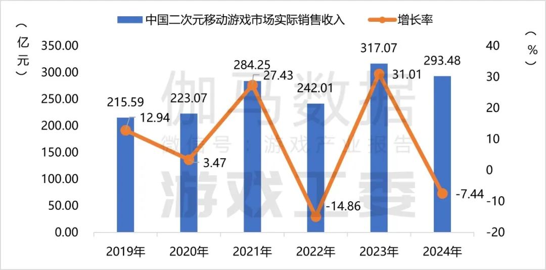 2024年,我国二次元移动游戏市场实际销售收入293.48亿元,同比下降7.44%。主要受到三种因素影响:一是去年该品类市场表现过于突出,使得今年相形见绌;二是市场竞争加剧,须与其他品类争夺有限玩家市场;三是玩家消费意愿有所减弱。