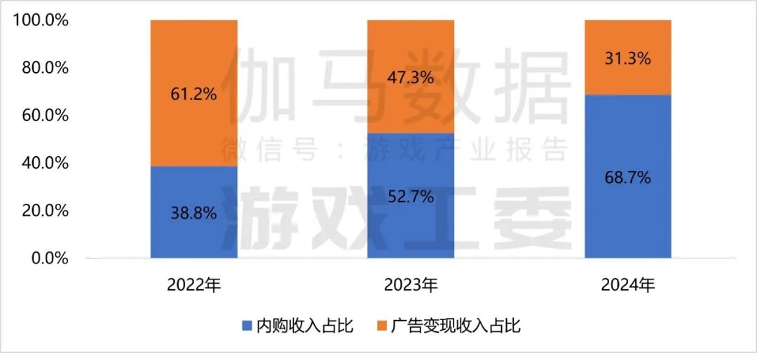 2024年,国内小程序游戏市场收入398.36亿元,同比增长99.18%,仍处于快速成长期。其中内购产生的市场实际销售收入273.64亿元,占比68.7%;广告变现收入124.72亿元,占比31.3%。