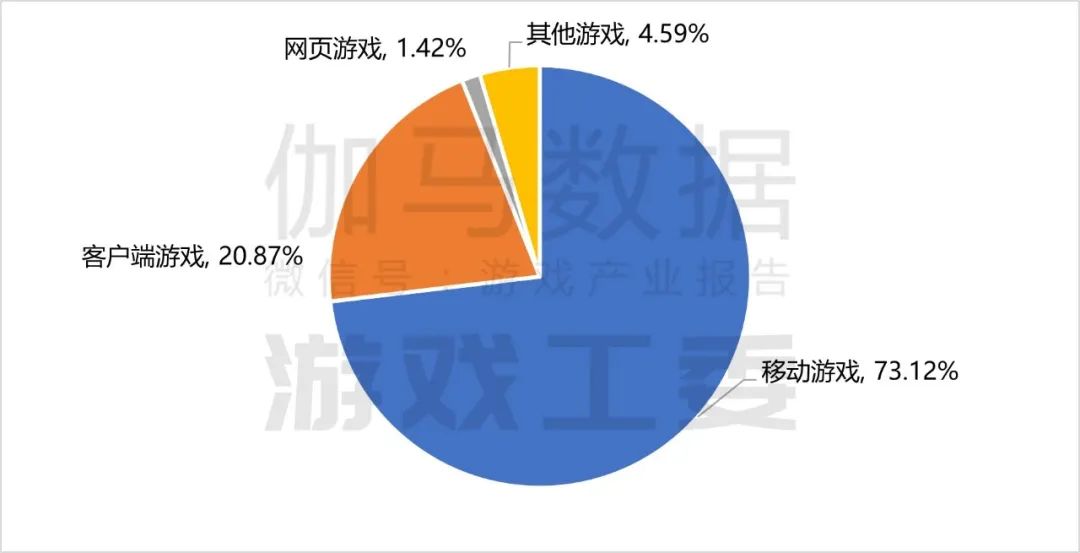 在细分市场中,移动游戏实际销售收入占比为73.12%,仍稳居主导地位;客户端游戏实际销售收入占比20.87%;网页游戏市场实际销售收入占比为1.42%。由于本年度有现象级产品出现,使上述之外游戏市场占比,从去年的1.67%大幅增至今年的4.59%。受其影响,移动、客户端、网页游戏三者占比较去年均有所下降。