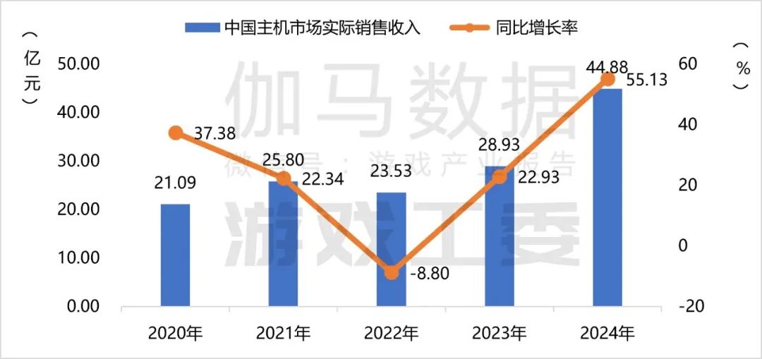2024年中国主机游戏市场实际销售收入44.88亿元,同比增长55.13%。主机游戏市场规模的明显扩张,主要得益于现象级新品的优异表现。