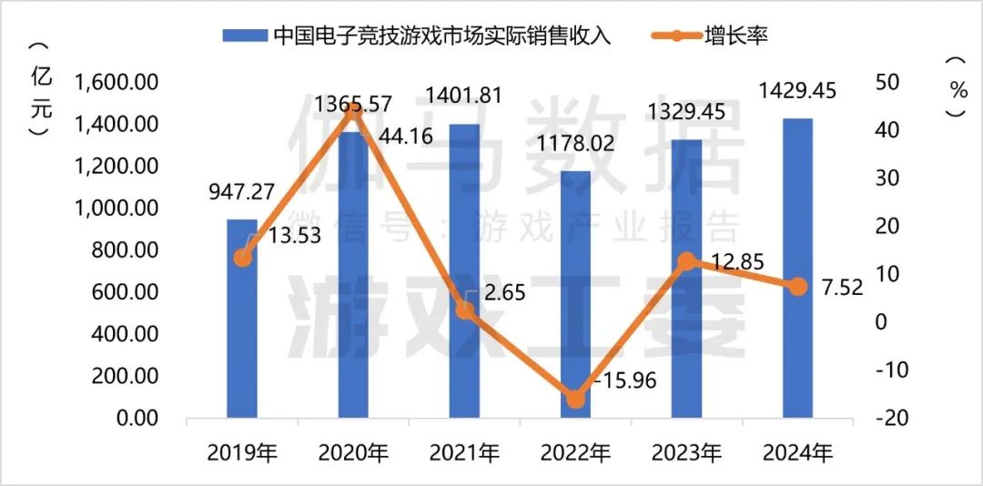 2024年,中国电子竞技游戏市场实际销售收入1429.45亿元,同比增长7.52%。主要归功于头部电竞游戏的长线运营,巩固了电竞市场基本盘。同时多款不同品类的电竞游戏新品面市,也创造了可观的市场增量。
