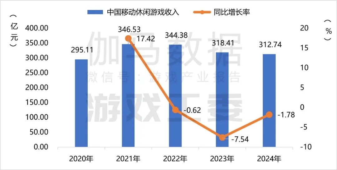 2024年,国内移动休闲游戏市场实际销售收入312.74亿元,同比下降1.78%,已连续三年下降,新品数量减少等因素,是导致销售收入持续下滑的主因。