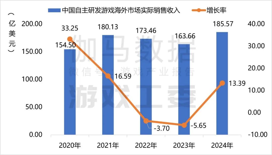 2024年,中国自主研发游戏海外市场实际销售收入185.57亿美元,同比增长13.39%,其规模已连续五年超千亿元人民币,并再创新高。面对全球游戏市场增速放缓、竞争日趋激烈的国际环境,国内游戏企业积极应对,表现依然出色。