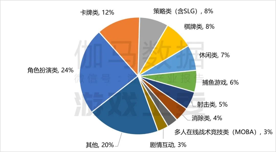 从数量上看,2024年,在收入排名前100的移动游戏产品中,角色扮演类居首,占比24%,同比下降7%。卡牌类居次,占比12%,同比去年上升一位。策略和棋牌类占比均为8%。需要留意的是,去年占比位居第四的射击类游戏,今年大幅降至第七位。