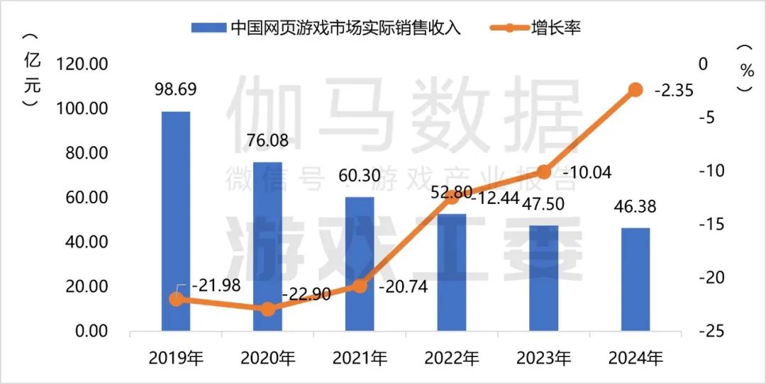 网页游戏市场实际销售收入同比下降2.35%,整体规模为46.38亿元,已是连续第九年下滑。