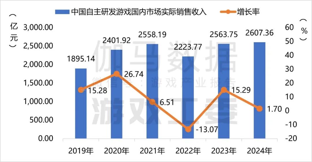 2024年,中国自主研发游戏国内市场实际销售收入2607.36亿元,同比增长1.70%,增速有所放缓。主要是受到市场竞争加剧和研发及获客成本持续攀升的影响。