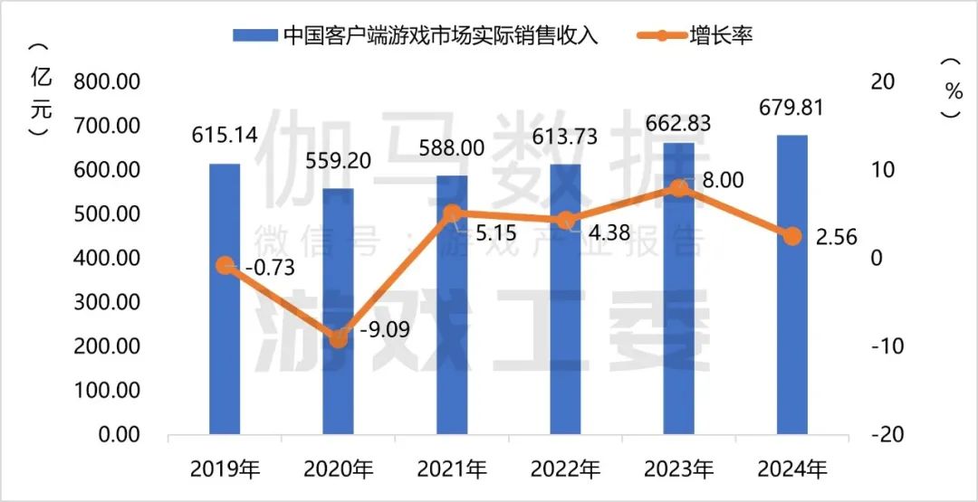2024年,我国客户端游戏市场实际销售收入679.81亿元,同比增长2.56%。主要得益于头部长青游戏的稳定表现,以及多部移动游戏新品在PC端的同步发行。