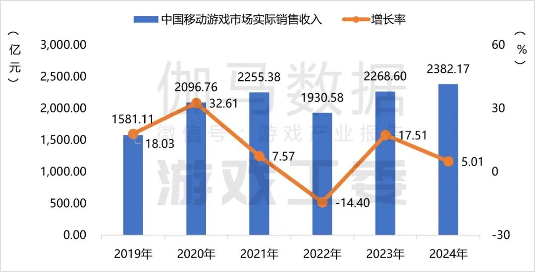 2024年中国移动游戏市场实际销售收入2382.17亿元,同比增长5.01%,再创市场收入新纪录。