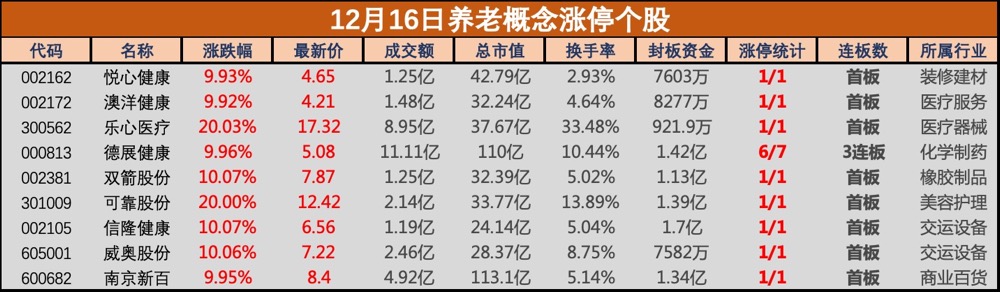 12月16日,养老概念大涨,悦心健康(002162)、澳洋健康(002172)、双箭股份(002381)、可靠股份(301009)等近10股涨停,奥佳华(002614)、康力源(301287)等涨幅靠前。