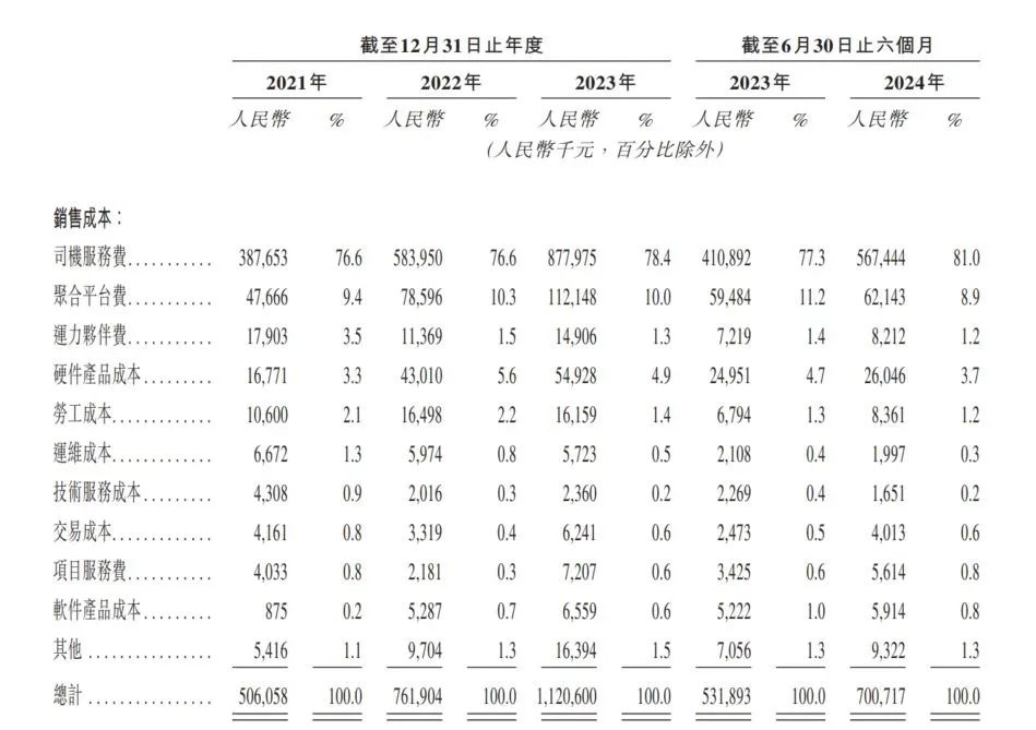 成本增长的主要原因有两方面。一是司机成本的攀升。为了完成订单,盛威时代需要向司机支付奖励,这部分费用从2021年的3.88亿元增至2022年的5.84亿元,直接推动销售成本从5.06亿元飙升至7.62亿元,增幅达50.6%。