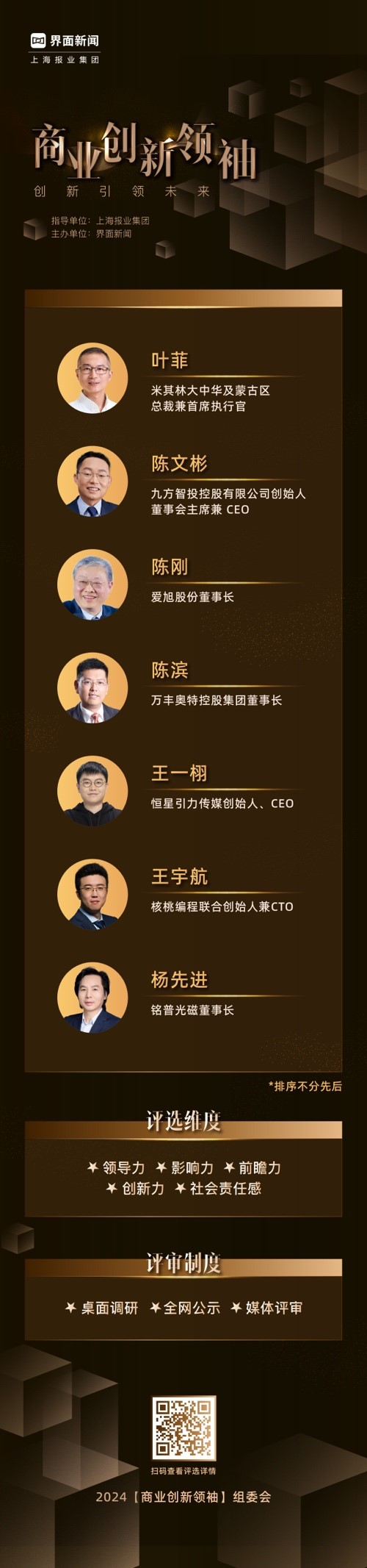 12月18日,上海报业集团|界面新闻在上海世博创意秀场(上海市黄浦区半淞园路498号)举办了【2024商业创新领袖】颁奖典礼,正式公布了本年度的获奖名单。评选旨在寻找变局之下引领商业发展的领袖领袖,致敬敢为人先的企业家精神。经过领导力、影响力、前瞻力、创新力和社会责任感等方面的评估,最终7位以创新为己任的商业领袖荣登年度荣誉榜单。