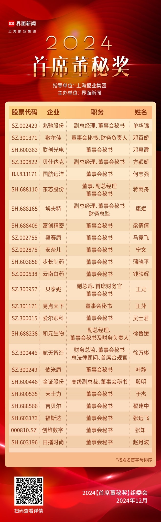 12月18日,上海报业集团|界面新闻在上海世博创意秀场举办了【2024首席董秘奖】颁奖典礼。本次评选秉持独立、客观、科学的原则,通过严格的评选流程,包括评选征集、模型评价、网络投票以及专家评审等环节,以确保评选结果的公正性和社会价值。年度榜单于12月18日当天正式揭晓,24位董秘喜摘桂冠!