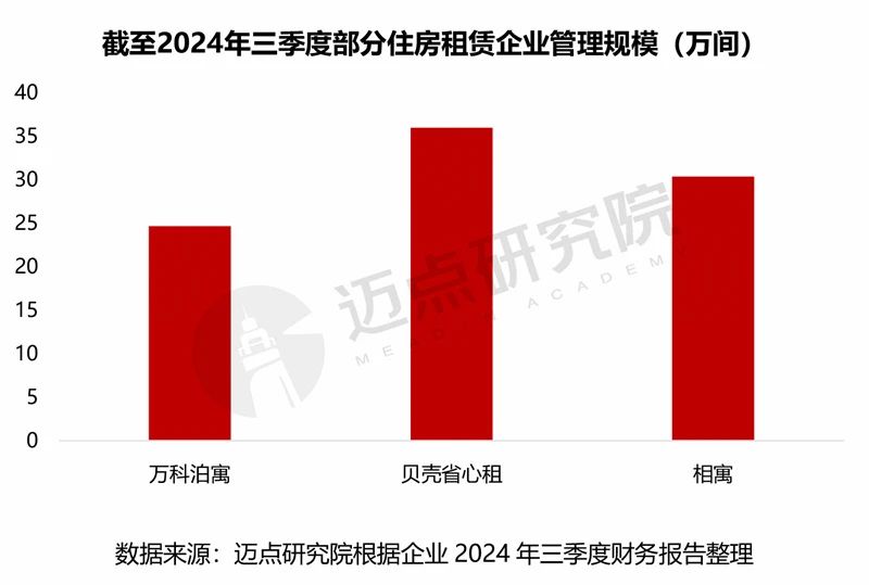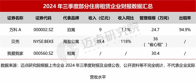 据迈点研究院不完全统计,截至2024年12月10日,重点监测的住房租赁相关企业中,有12家发布了2024年三季度财报,其中3家披露了住房租赁业务相关情况,分别为:万科、贝壳和我爱我家。