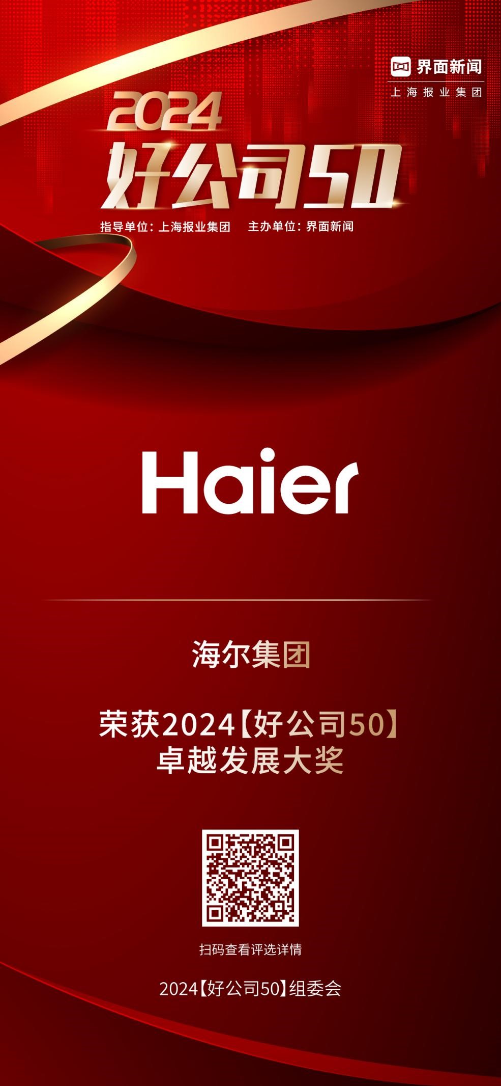 其中,海尔集团荣获【2024好公司50】卓越发展大奖。