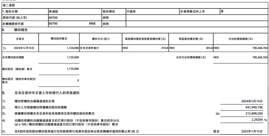 腾讯控股12月16日在港交所公告,今日斥资约7亿港元回购172万股公司股份,每股回购价格403.8港元-410.8港元。