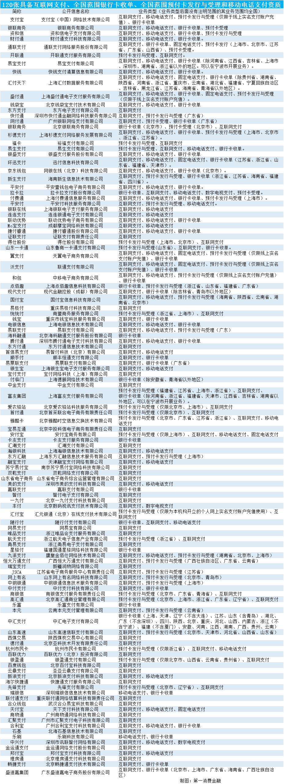 第一消费金融筛选出具备以下四种资质——互联网支付;全国(或者接近全国范围)范围银行卡收单;全国(或者接近全国范围)预付卡发行与受理;移动电话支付——的牌照共120张。