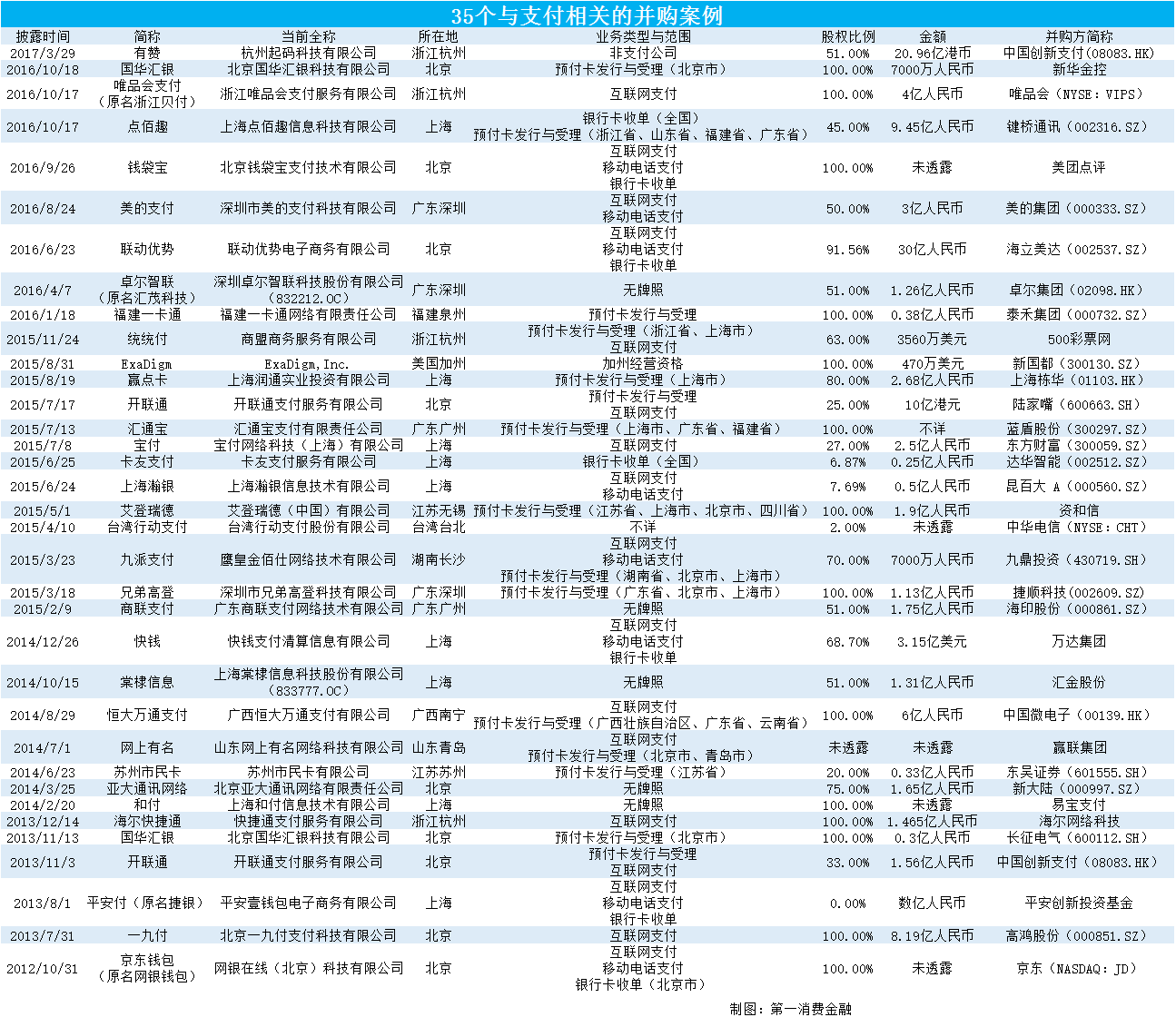 截止2017年3月30日,据第一消费金融不完全统计,支付领域相关的并购案例目前已经发生35起。