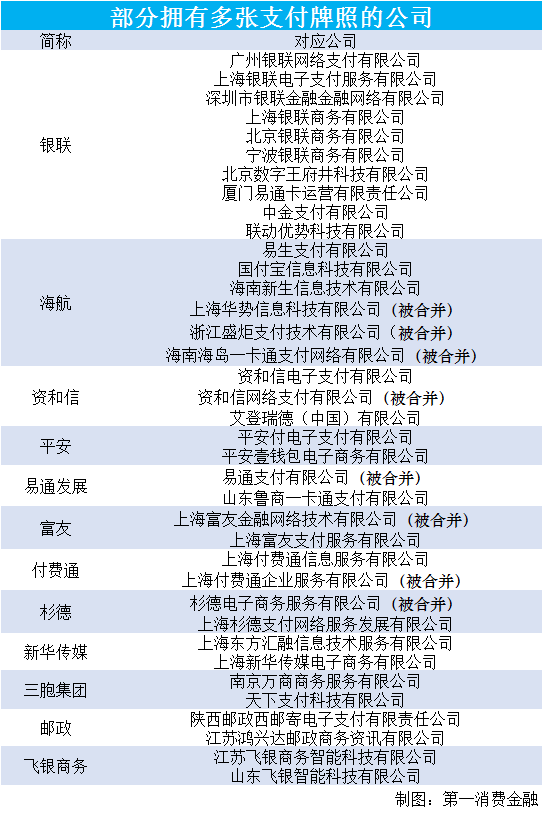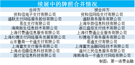 六、牌照合并。如易生支付有限公司合并上海华势信息科技有限公司支付业务。双方在规定时间前完成相关支付业务承接工作后,央行为双方办理相关《支付业务许可证》的注销、换发事宜。合并前,易生支付业务类型与范围为全国范围的互联网支付、预付卡发行与受理;上海华势的业务类型和范围为全国范围的银行卡收单。续展后,完成牌照合并的易生支付业务类型与范围就变成了全国范围的预付卡发行与受理、互联网支付和银行卡收单。实际上,续展后易生支付的业务类型和范围还包括其新申请的全国范围的移动电话支付。
