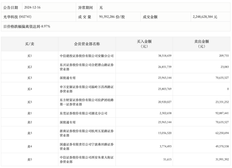 12月16日,光华科技今日跌停,龙虎榜数据显示,上榜营业部席位全天成交4.9亿元,占当日总成交金额比例为21.8%。其中,买入金额为1.59亿元,卖出金额为3.31亿元,合计净卖出1.72亿元。