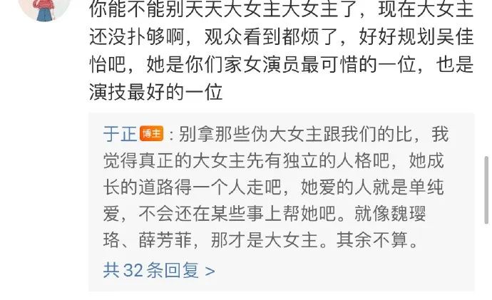 12月3日官宣女主时,于正又称《吉天照》女主是大女主,被粉丝炮轰:大女主剧太扑,观众已经看腻了。
