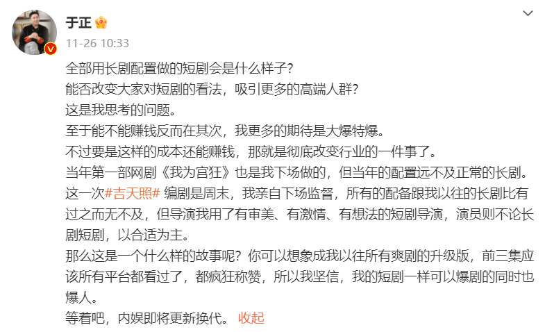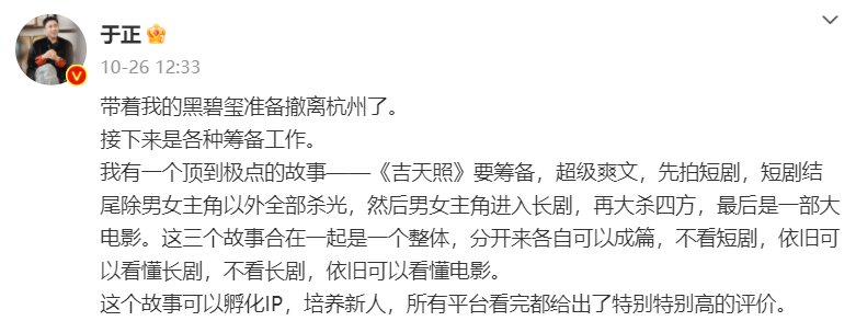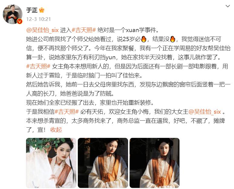 近日,于正在微博公布了其短剧《吉天照》的主演信息。