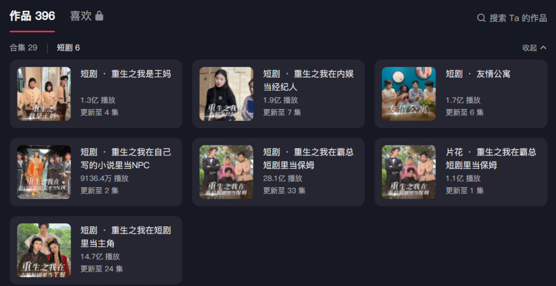 七颗猩猩也是另一个典型的例子。前期,七颗猩猩因拍摄“大学日常”短视频爆火。今年3月开始,七颗猩猩开始拍摄《重生只我在霸总短剧里当保姆》等以“保姆王妈”为主角的短剧合集,单月涨粉300万。今年她成功转入短剧赛道,更新的视频内容多为短剧。目前七颗猩猩抖音主页已上传6部短剧,其中播放量最高的为《重生之我在霸总短剧里当保姆》,达28.1亿。