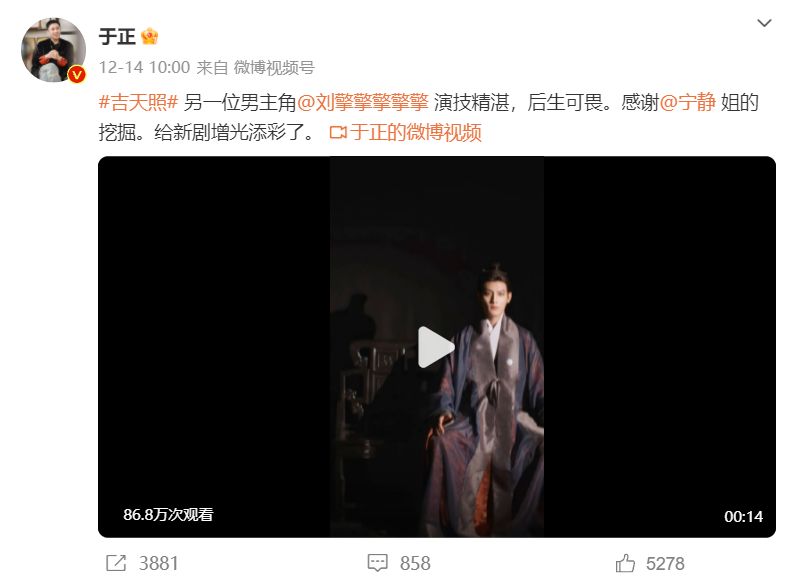 14日,于正还公布了《吉天照》的另一位男主角,刘擎。这次他直接用视频的形式曝光,视频中刘擎和女主的互动非常带感。14秒的视频播放量达86.8万。