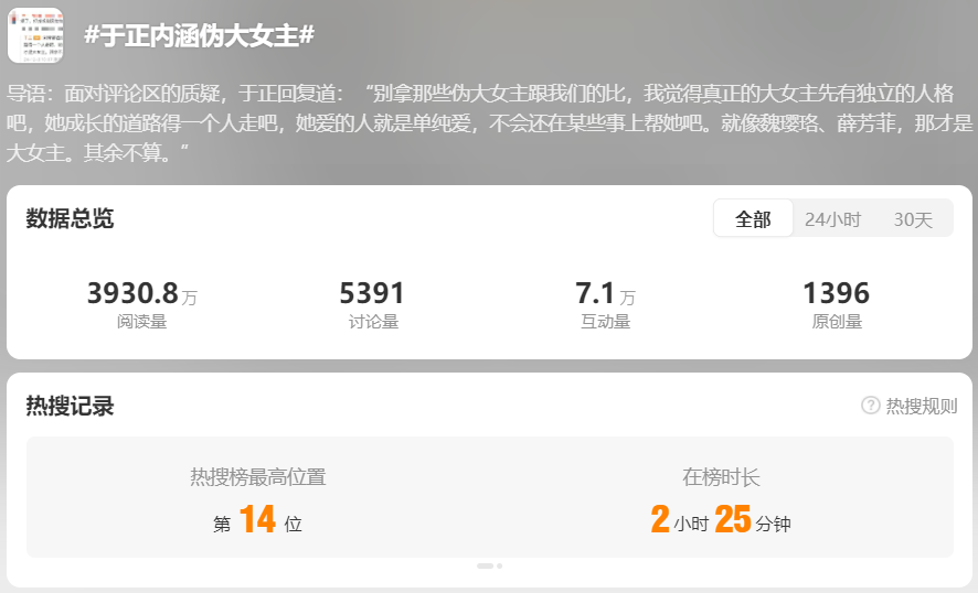 对此,于正回应道其他大女主剧都是伪大女主,像魏璎珞、薛芳菲才是真正的大女主。言语直指“只有自己的剧才是真正的大女主剧”,引得粉丝不快,#于正内涵伪大女主 话题阅读量接近4000万。