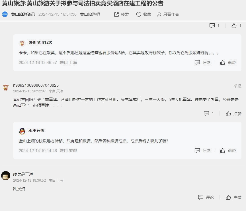 这也意味着,即便上述酒店均投入使用,黄山旅游还需很长一段时间才能收回改造成本。这也难怪有股民在贴吧中调侃,“从黄山旅游一贯的工作方针分析,买完建成后,三年一大修,5年大拆重建。”