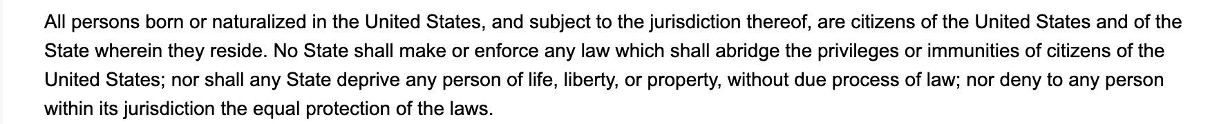 全美各州于1868年内战结束后通过了该修正案,其中“管辖领土”包括波多黎各、关岛、美属维尔京群岛、北马里亚纳群岛等。所涉及群体不包括外交官子女。1898年“联邦诉黄金德案”的裁进一步巩固了“出生公民权”。