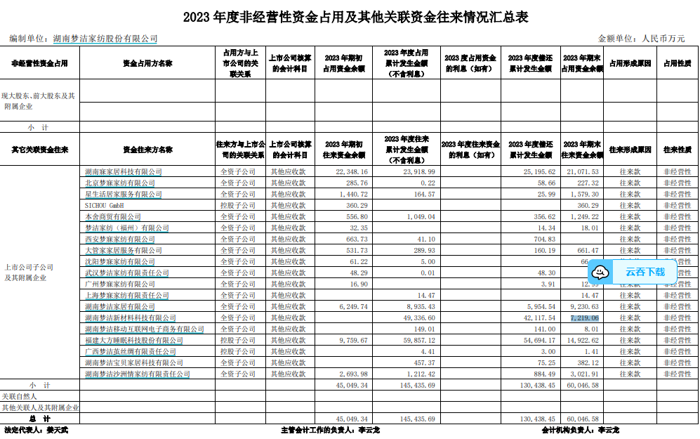 而且,本次担保的5家子公司其中4家,均存在占用上市公司资金行为。依据天职国际会计师事务所出具的《2023年度关联方资金占用专项审计报告》可见,湖南寐家居公司占用梦洁股份2.1亿元资金;福建大方占用1.49亿元;梦洁新材料占用7219万元;梦洁宝贝占用资金382万元。