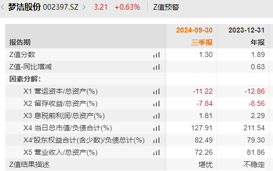 公司的营收和利润均出现显著下滑,这为梦洁股份未来的发展蒙上了阴影。WIND数据Z值预警(通过财务比率预测财务危机的工具。)将梦洁股份2023年末的不稳定判断,在今年三季报出炉后,调整为“堪忧”。