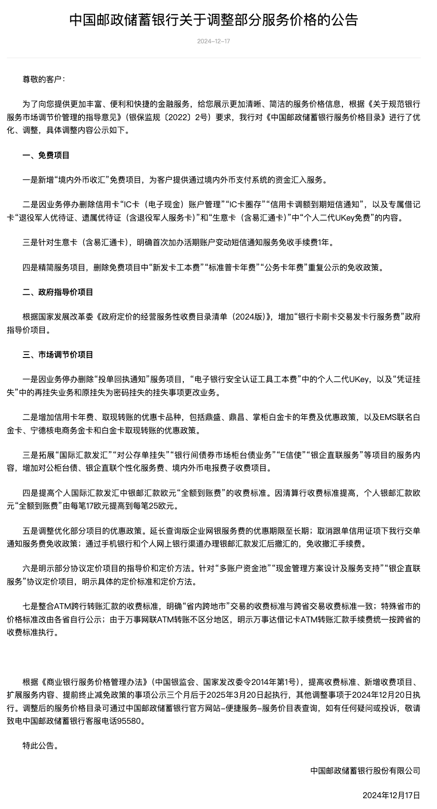 12月17日,中国邮政储蓄银行发布关于调整部分服务价格的公告。其中,免费项目方面,新增“境内外币收汇”免费项目,为客户提供通过境内外币支付系统的资金汇入服务;针对生意卡(含易汇通卡),明确首次加办活期账户变动短信通知服务免收手续费1年;精简服务项目,删除免费项目中“新发卡工本费”“标准普卡年费”“公务卡年费”重复公示的免收政策。