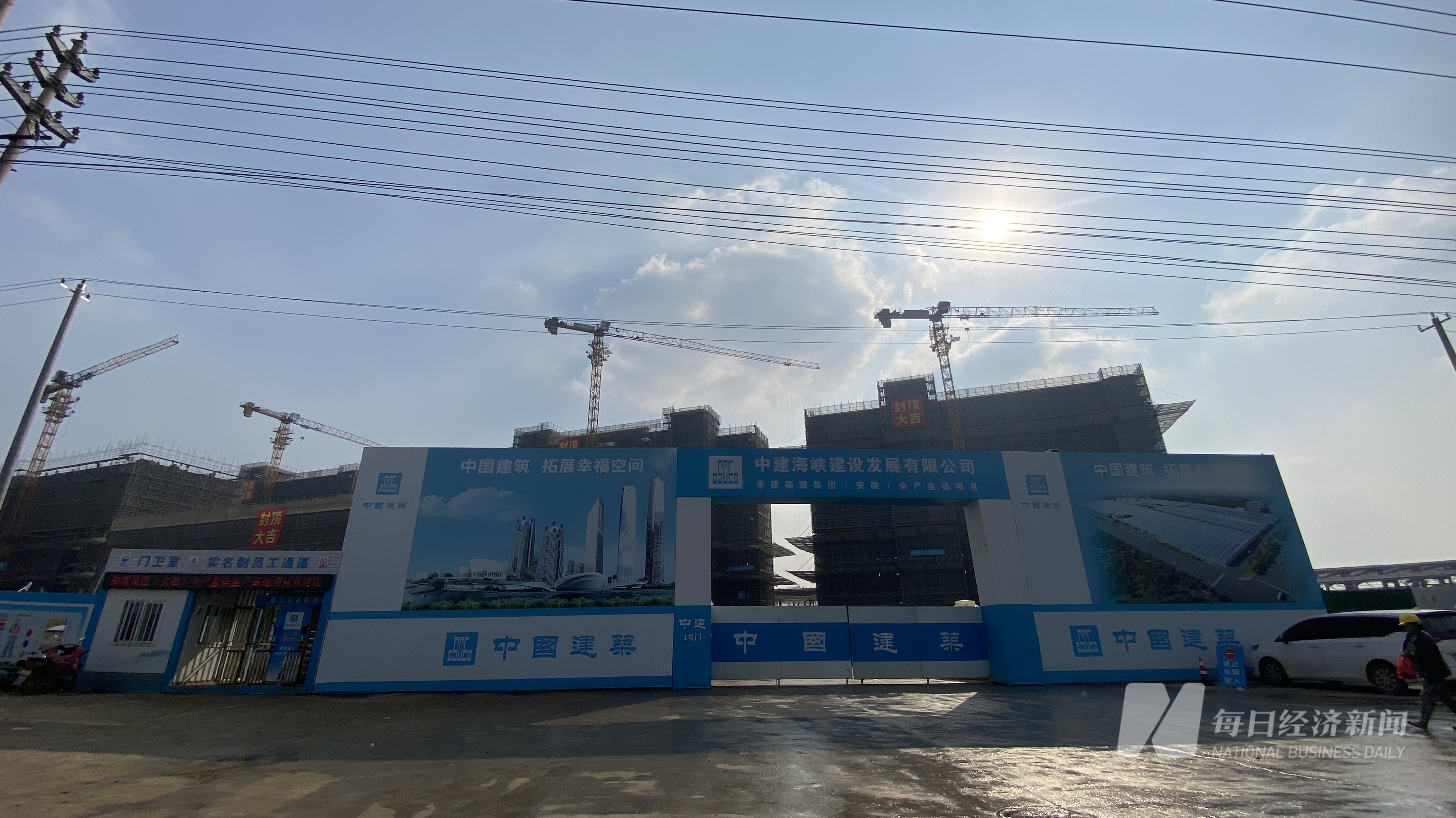 12月12日,《每日经济新闻》记者实探项目现场获悉,这个总投资57.5亿元的项目,于今年1月27日签约,4月8日正式开工,计划于12月实现主厂房封顶。从目前现场情况来看,项目如期进行,几栋主建筑物的顶部拉着红色横幅,上面写着“封顶大吉”。厂区内部和周围,有不少建筑工人走动,施工现场持续传来机械工作的轰鸣声。