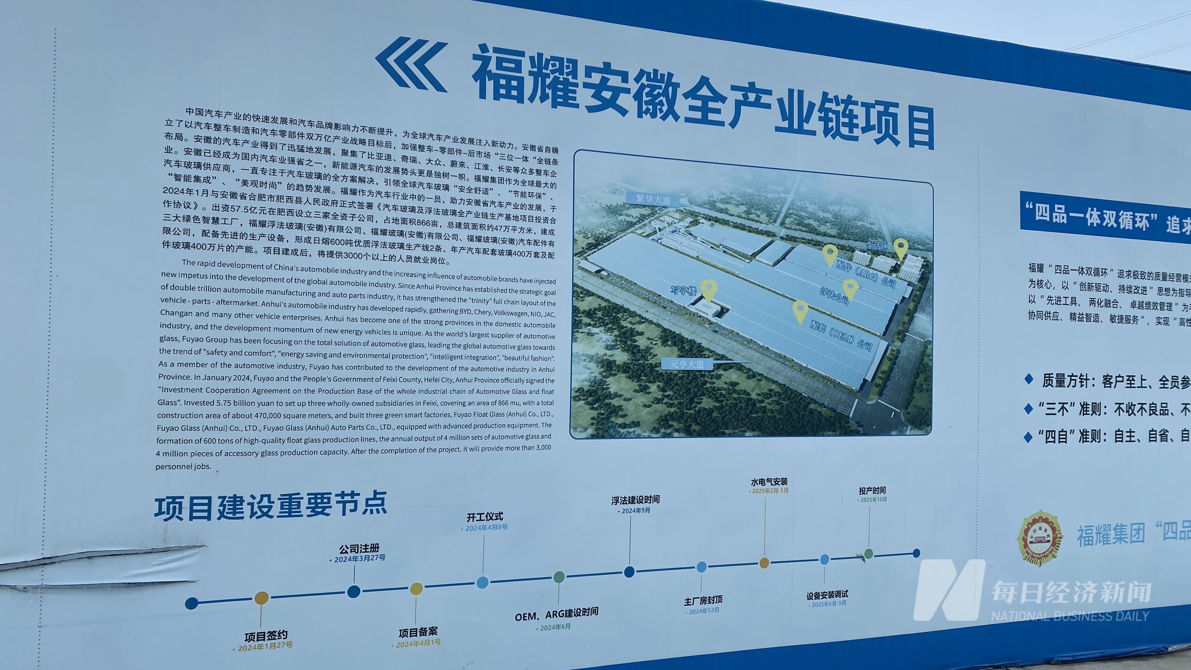 根据项目重要节点安排,福耀安徽全产业链项目将在明年2—5月完成水电安装,6—9月进行设备安装调试,计划在2025年10月投产。