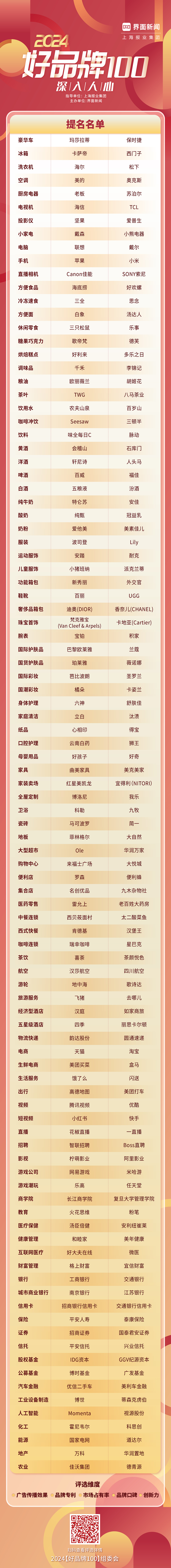 在此背景下,上海报业集团 | 界面新闻再度举办2024【好品牌100】评选活动。本次评选活动以寻找讲好品牌故事、拥有核心竞争力、持续创新、面向国际的“好”品牌,推动社会各界参与共建繁荣的品牌生态为目标,将聚集100位专家,聚焦100个行业赛道,最终评选出100个好品牌。由此,我们期待与各行各业对品牌发展有所思考的同仁一道,在对“好品牌”不断的重访中,寻得中国社会品牌向更好,向更善发展的未来可能。